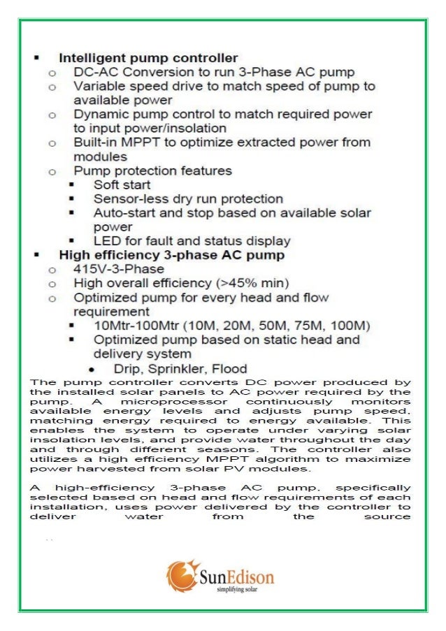 Powering Agriculture : Affordable & Reliable Solar Water Pumping . for Irrigation ( Intervention & Up scaling) • SunFarmer is backed by SunEdison, the largest solar 2. < 5%* of farmers has access to pump technology for ... Read More